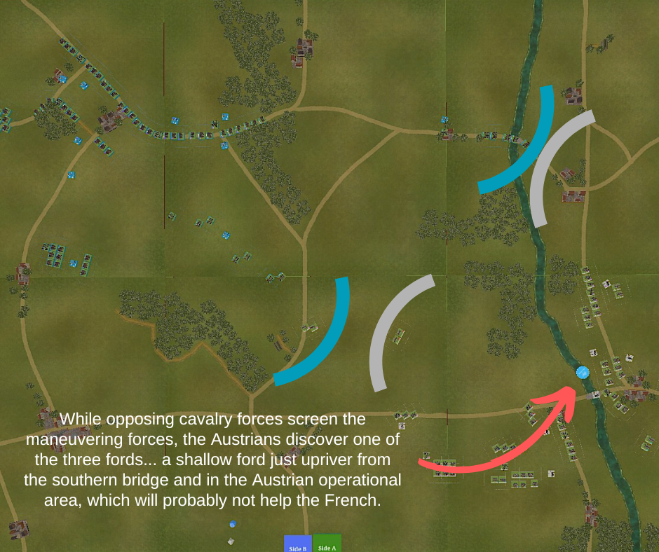 By the fourth turn, the cavalry screens finally clashed in a series of sharp skirmishes. Although the Austrians managed to uncover the first of the hidden fords, the French left-wing French cavalry division forced its way across the northern bridge and secured a tenuous bridgehead. Meanwhile, the bulk of both armies pressed steadily forward along the road network, closing the distance for the larger fight to come.