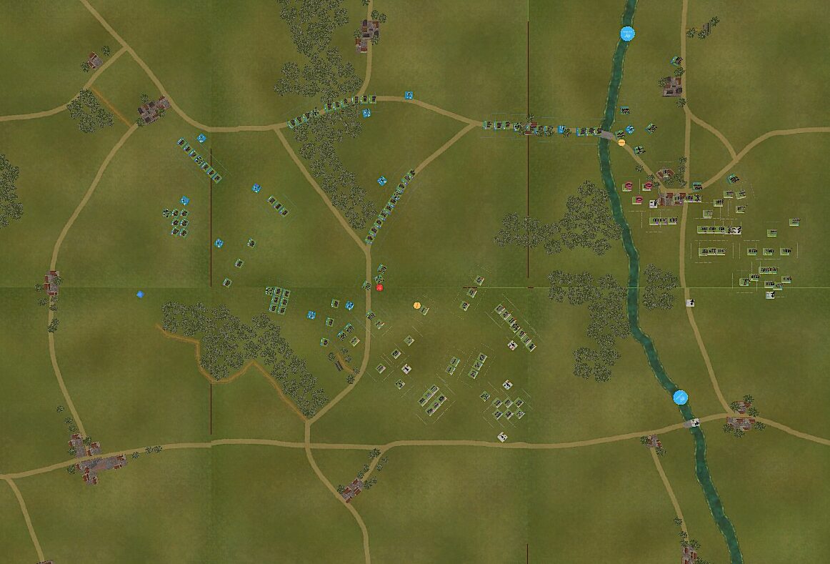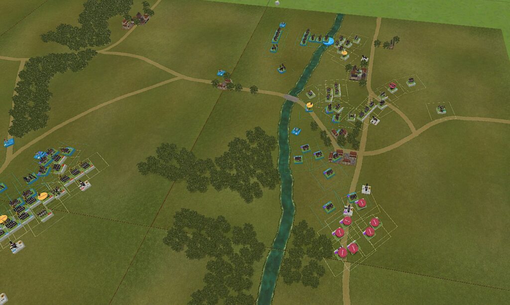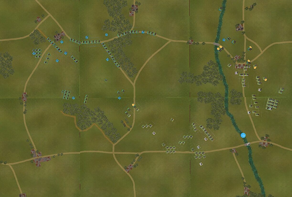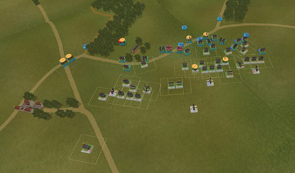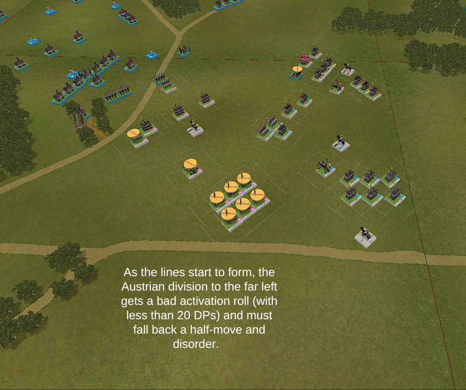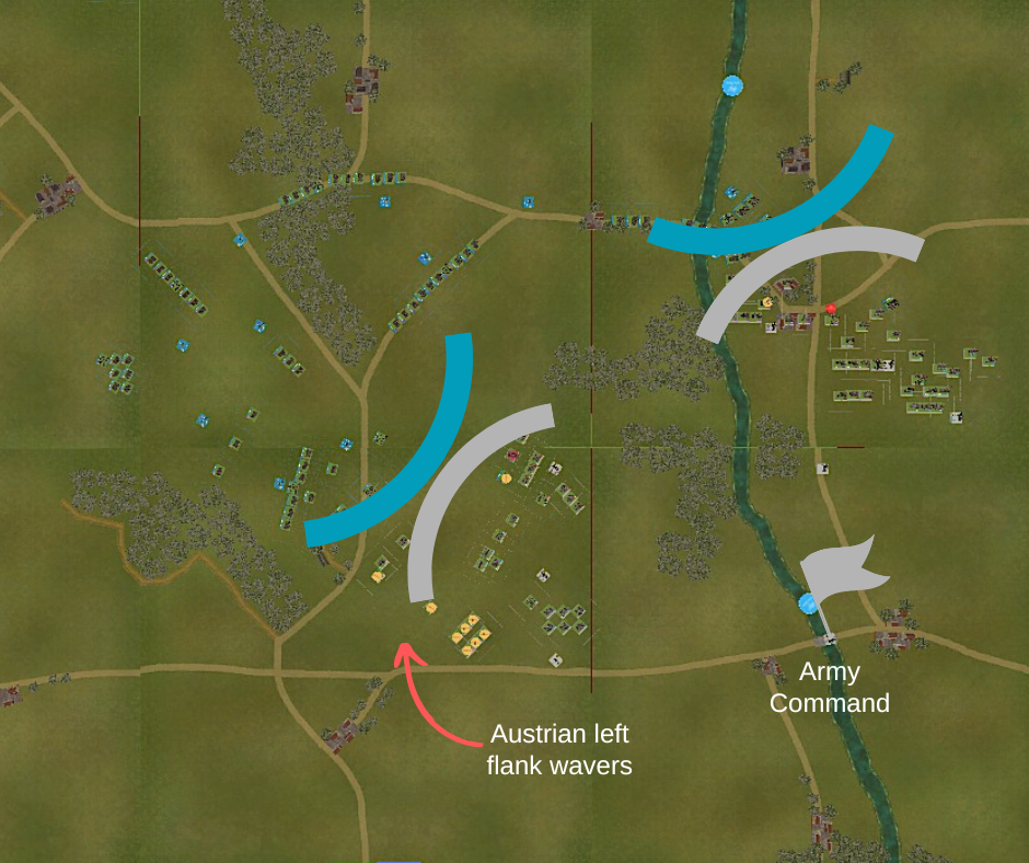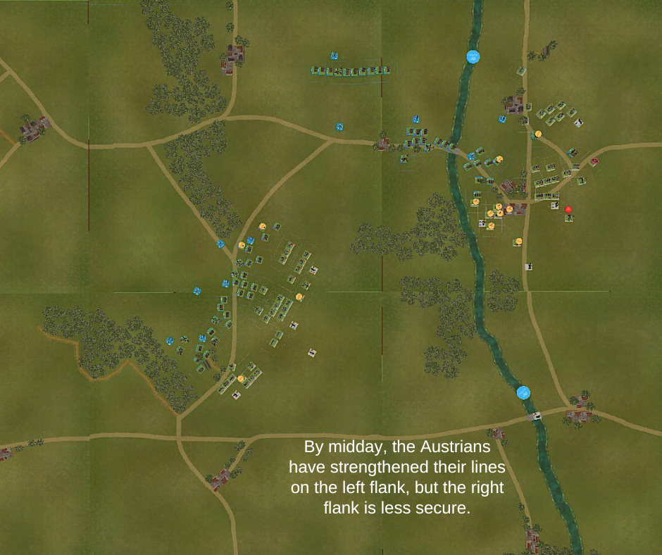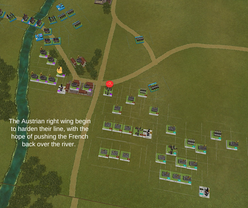 Meanwhile, the Austrian left flank attempted to threaten the French line of attack. The Austrian’s shorter Command and Control distances kept them from extending too far as the Army commander, located at the southern bridge, is trying to stay in touch with both of his wings.