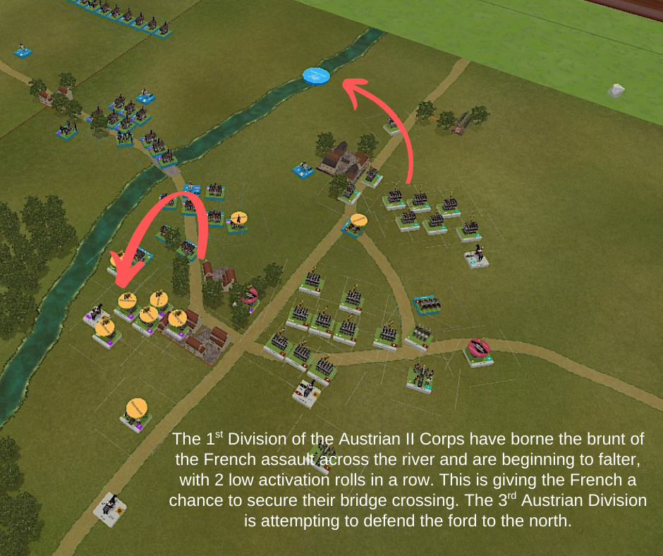 Meanwhile, on the Austrian right flank, the 1st Division of Austrian II Corps had been bearing the brunt of the struggle at the northern bridge for hours. Alone, they had held with grim determination, pushing the French back against the very timbers of the bridge and the riverbank itself. Yet their valor could not defy exhaustion forever. After a string of punishing activation rolls, their cohesion faltered, and the line began to fall back in disorder. The French seized the moment, expanding their precarious foothold on the eastern bank.
