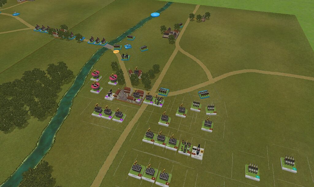 Within the next two turns, the French have located a second ford to the north of the bridge, which can help them to cross the river. Additionally, the first of the French infantry divisions approached the bridge, putting more pressure on the Austrian right to consolidate their position. Austrian infantry between the river and the village have formed square to thwart the French cavalry’s advance.